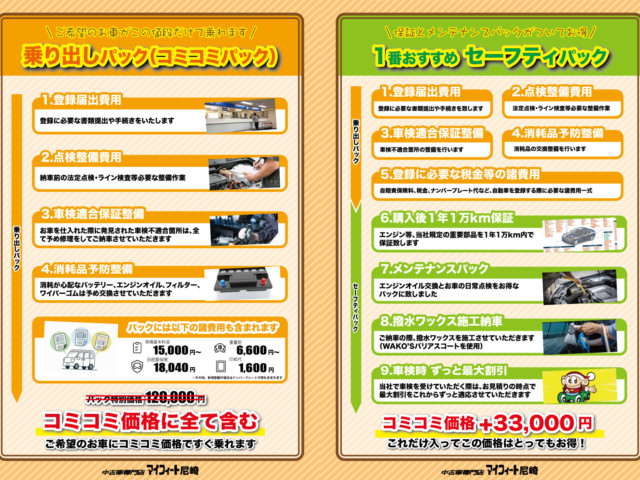 当社の販売パッケージ「セーフティパック」には1年1万kmの保証がございます。エンジン機構、エアコン機構、電装機構、ハイブリッド機構など多くの部位を保証しております。料金、内容など詳細は店頭でお問い合わせください!
